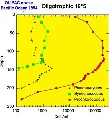 - Cyanobacteria belonging to the genus Prochlorococcus are particularly remarkable. With a typical size of 0.6 μm, Prochlorococcus was discovered only in 1988[7] by two American researchers, Sallie W. (Penny) Chisholm (Massachusetts Institute of Technology) and R.J. Olson (Woods Hole Oceanographic Institution). In spite of its small size, this photosynthetic organism is undoubtedly the most abundant of the planet: indeed its density can reach up to 100 million cells per liter and it can be found down to a depth of 150 m in all the intertropical belt.[17]