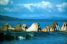 The walrus (Odobenus rosmarus) is a large flippered marine mammal from the Arctic Ocean and subarctic seas of the Northern Hemisphere.[23] Adult walrus are characterised by prominent tusks and whiskers, and their considerable bulk: adult males in the Pacific can weigh more than 2,000 kg (4,400 lb)[24]