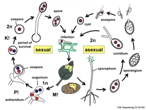 The asexual life cycle of Phytophthora infestans is characterized by alternating phases of hyphal growth, sporulation, sporangia germination (either through zoospore release or direct germination, i.e. germ tube emergence from the sporangium), and the re-establishment of hyphal growth.[7] There is also a sexual cycle, which occurs when isolates of opposite mating type (A1 and A2, see § Mating types below) meet. Hormonal communication triggers the formation of the sexual spores, called oospores.[8] The different types of spores play major roles in the dissemination and survival of P. infestans. Sporangia are spread by wind or water and enable the movement of P. infestans between different host plants. The zoospores released from sporangia are biflagellated and chemotactic, allowing further movement of P. infestans on water films found on leaves or soils. Both sporangia and zoospores are short-lived, in contrast to oospores which can persist in a viable form for many years.