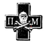The Pi Mu badge was a Greek cross with a skull and bones at the center. The skull was set with emerald eyes and the letters ΠΜ displayed on the horizontal arm of the cross.[3] The design of the Phi Chi pledge button was changed at the time of the Pi Mu merger in 1922 to honor the Pi Mu honor system. The badge of Pi Mu, a Greek cross carrying the skull and crossbones in addition to the Greek letters ΠΜ, by agreement became Phi Chi's pledge button with the substitution of a caduceus and the letters ΦΧ in silver on a field of green.[3]