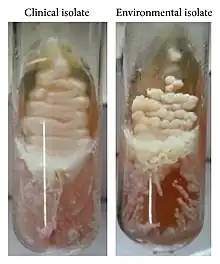 P. kudriavzevii grows best at a temperature of 43–45 °C (109–113 °F). Other Candida species are a major differential diagnosis and these generally require biotin for growth and some have additional vitamin requirements, but P. kudriavzevii can grow in vitamin-free media. Also, P. kudriavzevii grows on Sabouraud's dextrose agar as spreading colonies with a matte or a rough whitish-yellow surface, in contrast to the convex colonies of Candida spp. This characteristic, together with its "long grain rice" appearance on microscopy, helps the definitive identification of the species.