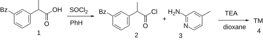 Thionyl chloride reacts with ketoprofen to form its acid chloride (2). Amide formation with 2-amino-4-methylpyridine (3) gives piketoprofen.[3][4]