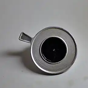 A pinhole occluder is an opaque disk with one or more small holes through it, used by ophthalmologists, orthoptists and optometrists to test visual acuity. The occluder is a simple way to focus light, as in a pinhole camera, temporarily removing the effects of refractive errors such as myopia. Because light passes only through the center of the eye's lens, defects in the shape of the lens (errors of refraction) have no effect while the occluder is used. In this way, the ophthalmologist, orthoptist or optometrist can estimate the maximum improvement in a patient's vision that can be attained by lenses to correct errors of refraction.[2] This can be used to distinguish visual defects caused by refractive error, which improve when the occluder is used, from other problems, which do not.[3] The pinhole occluder can also be used in testing visual acuity in mydriatic patients. In this case, the pinhole occluder compensates for the inability to contract the iris assisting the eye in obtaining a retinal projection similar to that of a non-cycloplegic eye.