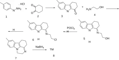 The Fischer indole synthesis between p-Tolylhydrazine Hydrochloride [637-60-5] (1) and 1,2-Cyclohexanedione [765-87-7] (2) gives 6-methyl-2,3,4,9-tetrahydrocarbazol-1-one [3449-48-7] (3). Imine formation with ethanolamine [141-43-5] (4) gives CID:2838578 (5). Halogenation with phosphorus oxychloride gives (6).[13] Intramolcular alkylation with the indole nitrogen resulted in Dehydropirlindole [75804-32-9] (7). Reduction of the imine with sodium borohydride completes the synthesis of pirlindole (8).