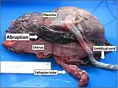Placental abruption is when the placenta separates early from the uterus, in other words separates before childbirth.[2] It occurs most commonly around 25 weeks of pregnancy.[2] Symptoms may include vaginal bleeding, lower abdominal pain, and dangerously low blood pressure.[1] Complications for the mother can include disseminated intravascular coagulopathy and kidney failure.[2] Complications for the baby can include fetal distress, low birthweight, preterm delivery, and stillbirth.[2][3]