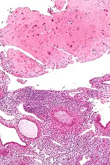 | Micrograph of a placental site nodule (top of image). H&E stain. |