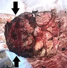 | Gross pathology of severe intervillositis, with dark red and soggy tissue. | |