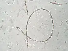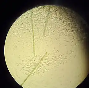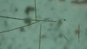 Planktothrix is a diverse genus of filamentous cyanobacteria observed to amass in algal blooms in water ecosystems across the globe. Like all Oscillatoriales, Planktothrix species have no heterocysts and no akinetes. Planktothrix are unique because they have trichomes and contain gas vacuoles unlike typical planktonic organisms.[1] Previously, some species of the taxon were grouped within the genus Oscillatoria, but recent work has defined Planktothrix as its own genus.[2] A tremendous body of work on Planktothrix ecology and physiology has been done by Anthony E. Walsby, and the 55.6 kb microcystin synthetase gene which gives these organisms the ability to synthesize toxins has been sequenced.[3] P. agardhii is an example of a type species of the genus.[4] P. agardhii and P. rubescens are commonly observed in lakes of the Northern Hemisphere where they are known producers of potent hepatotoxins called microcystins.[5]