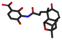 Platensimycin was first isolated from a strain of Streptomyces platensis by workers at Merck.[2][3] Screens of 250,000 natural product extracts (83,000 strains in three growth conditions) led to the identification of a potent and selective small molecule from a strain of Streptomyces platensis recovered from a soil sample collected in South Africa. The identification process was carried out using a two-plate system in which control organisms were compared to cells expressing FabF antisense RNA. This method uses a combination of target-based whole-cell and biochemical assays, allowing compounds to be detected at concentrations that would be too low to detect using whole cell assays. The molecule they identified, platensimycin (C24H27NO7, relative molecular mass 441.47), comprises two distinct structural elements connected by an amide bond. The Merck Group showed that platensimycin has potent, broad-spectrum Gram-positive activity in vitro and exhibits no cross-resistance to other key antibiotic-resistant bacteria including Methicillin-resistant Staphylococcus aureus(MRSA), vancomycin-intermediate S. aureus, vancomycin-resistant Enterococci, and linezolid-resistant and macrolide-resistant pathogens.
