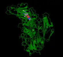 In enteroviruses, pleconaril prevents the virus from exposing its RNA, and in rhinoviruses pleconaril prevents the virus from attaching itself to the host cell.[7] Human rhinoviruses (HRVs) contain four structural proteins labeled VP1-VP4. Proteins VP1, VP2 and VP3 are eight stranded anti-parallel β-barrels. VP4 is an extended polypeptide chain on the viral capsid inner surface.[8] Pleconaril binds to a hydrophobic pocket in the VP1 protein. Pleconaril has been shown in viral assembly to associate with viral particles.[9] Through noncovalent, hydrophobic interactions compounds can bind to the hydrophobic pocket.[10] Amino acids in positions Tyr152 and Val191 are a part of the VP1 drug binding pocket.[8]