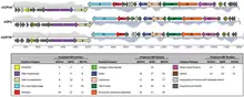 The double stranded DNA genome is linear, around 40-42kb in length,[3] and encodes ~55 genes. The guanine + cytosine content is ~50%. It has terminally redundant sequences and is nonpermuted. By weight, the genome constitutes ~50% of the viron. The genome encodes 9 structural proteins, an adenylated transferase B type DNA polymerase and an RNA polymerase. Three internal proteins constitute the polymerase complex. Two classes of genes are recognized (early and late). This classification is based on the timing of transcription that is temporally regulated. Genes with related functions are clustered together. Genome replication is bidirectional.