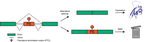 In 2002, a model termed regulated unproductive splicing and translation (RUST) was proposed based on the finding that many (~one-third) alternatively spliced transcripts contain PEs. In this model, coupling alternative splicing to NMD (AS-NMD) is thought to tune transcript levels to regulate protein expression.[3] Alternative splicing may also lead to NMD via other pathways besides PE inclusion, e.g., intron retention.[4][5]