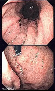 - ↑ Primignani M, Carpinelli L, Preatoni P, et al. (2000). "Natural history of portal hypertensive gastropathy in patients with liver cirrhosis. The New Italian Endoscopic Club for the study and treatment of esophageal varices (NIEC)". Gastroenterology. 119 (1): 181–7. doi:10.1053/gast.2000.8555. PMID 10889167.