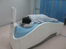 PEM uses a specialised scanning system. Though some systems resemble a small PET scanner with a ring of detectors, others consist of a pair of gamma radiation detectors placed above and below the breast. On these systems, mild breast compression is applied to spread the breast and reduce its thickness. The detection process is identical to standard PET scanners. Positrons emitted by the injected 18F-FDG annihilate on interaction with electrons in tissue, leading to the emission of a pair of photons travelling in opposite directions. The detection of two simultaneous photons indicates the emission of a positron at a point on the line linking the two detection events. An image is the reconstructed from the collected emission data.[9][10]