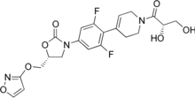 - ↑ Wookey A, Turner PJ, Greenhalgh JM, Eastwood M, Clarke J, Sefton C (March 2004). "AZD2563, a novel oxazolidinone: definition of antibacterial spectrum, assessment of bactericidal potential and the impact of miscellaneous factors on activity in vitro". Clinical Microbiology and Infection. 10 (3): 247–54. doi:10.1111/j.1198-743X.2004.00770.x. PMID 15008947.