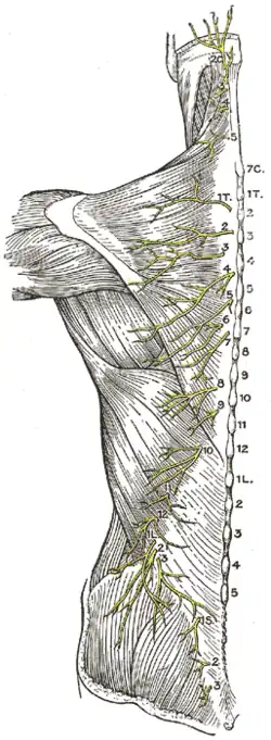 ![]() Diagram of the distribution of the cutaneous branches of the posterior divisions of the spinal nerves. | |