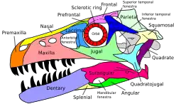 A skull diagram of Dromaeosaurus, a dromaeosaurid dinosaur. The postorbital is colored dark blue.
