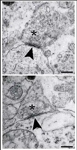 ![]() Ultra-structural analysis of synapses in the brainstem of wild-type (WT) mice at embryonic day 18.5. Synapses of WT neurons in the pre-Bötzinger-complex area exhibit presynaptic vesicles (asterisks), a synaptic cleft and a distinct postsynaptic density (arrowheads). Scale bar, 250 nm. From Heupel et al., 2008 | |