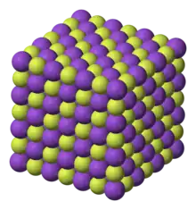 KF crystallizes in the cubic NaCl crystal structure. The lattice parameter at room temperature is 0.266 nm.[4]