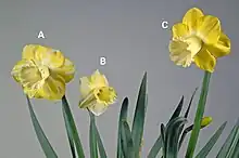 | Color break symptoms caused by narcissus mosaic virus (NMV) in daffodils (A, B) and normal flower (C) | |