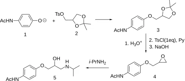 A synthesis is available which relates the absolute configuration of the more potent optical isomer to (+)-lactic acid. The glycerol derivative (2) is available from D-mannitol and retains optical activity as the two 1° alcohol functions are differentially protected. Displacement with sodium p-acetamidophenoxide (1, deprotonated paracetamol) gives 3 which is deprotected with dilute acid, the primary alcohol function is selectively reacted with one molar equivalent of tosyl chloride and pyridine, then treated with NaOH in dimethylsulfoxide to yield 3. Epoxide opening with isopropylamine leads to optically active prolactolol (4).