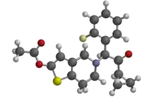 - ↑ Rehmel JL, Eckstein JA, Farid NA, Heim JB, Kasper SC, Kurihara A, et al. (April 2006). "Interactions of two major metabolites of prasugrel, a thienopyridine antiplatelet agent, with the cytochromes P450". Drug Metabolism and Disposition. 34 (4): 600–607. doi:10.1124/dmd.105.007989. PMID 16415119. S2CID 1698598.