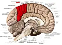 ![]() Medial surface of left cerebral hemisphere. (Precuneus visible at top left.) (Anterior to the right.) | |