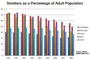 According to Israel Central Bureau of Statistics, the smoking rate in the Israeli adult population in 2009 was 20.9%, down from 34% in 2000.[39] A Ministry of Health nationwide survey conducted in 2011 found that 20.6% of the population aged 21 and older were smokers.[40] The highest percentage of smokers was among Arab males, 44% percent of whom smoked, though this figure is down from 50% in 1996.