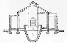 Later improvements, such as a midden closet built in Nottingham, used a brick-raised seat above a concave receptacle to direct excreta toward the centre of the pit—which was lined with cement to prevent leakage into the surrounding soil. This closet was also designed with a special opening through which deodorising material could be scattered over the top of the pit. A ventilation shaft was also installed. The design offered a significant improvement over the less advanced midden-privy, but the problems of emptying and cleaning such pits remained and thus the pail system, with its easily removable container, became more popular.[2]