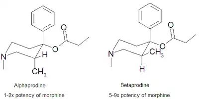 There are two isomers of the trans form of prodine, alphaprodine and betaprodine. Both exhibit optical isomerism and alphaprodine and betaprodine are racemates.[3] Alphaprodine is closely related to desomorphine in steric configuration.[3] The cis form also has active isomers but none are used in medicine.[3][4] Betaprodine is around five times more potent than alphaprodine[5] but is metabolized more rapidly, and only alphaprodine was developed for medicinal use. It has similar activity to pethidine, but with a more rapid onset and shorter duration of effects.[6] Betaprodine produces more euphoria and side effects than alphaprodine at all dose levels, and it was found that 5 to 10 mg of betaprodine is equivalent to 25 to 40 mg of alphaprodine.[3]