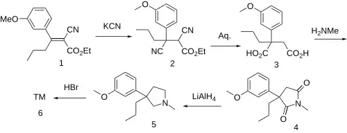 The Knoevenagel condensation between 3'-Methoxybutyrophenone [21550-06-1] and Ethyl cyanoacetate gives (1). Conjugate addition of cyanide gives (2). Hydrolysis of both nitrile groups, saponification of the ester and decarboxylation gives the diacid, CID:164137621 (3). Imide formation occurs upon treatment with methylamine giving 3-(3-Methoxyphenyl)-1-methyl-3-propylpyrrolidine-2,5-dione, CID:163444474 (4). Reduction of the imide by lithium aluminium hydride gave [1505-32-4][29369-01-5] (5). Demethylation completed the synthesis of Profadol (6).