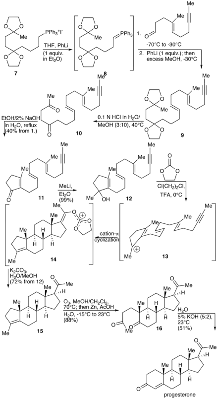 168. 1 2 3 Johnson WS, Gravestock MB, McCarry BE (August 1971). "Acetylenic bond participation in biogenetic-like olefinic cyclizations. II. Synthesis of dl-progesterone". Journal of the American Chemical Society. 93 (17): 4332–4334. doi:10.1021/ja00746a062. PMID 5131151.