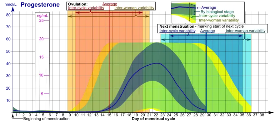 142. Häggström M (2014). "Reference ranges for estradiol, progesterone, luteinizing hormone and follicle-stimulating hormone during the menstrual cycle". WikiJournal of Medicine. 1 (1). doi:10.15347/wjm/2014.001. ISSN 2002-4436. S2CID 88035135.