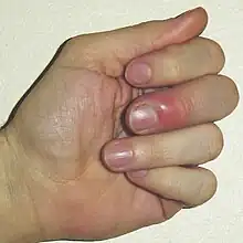 Acute paronychia is an infection of the folds of tissue surrounding the nail of a finger or, less commonly, a toe, lasting less than six weeks.[4] The infection generally starts in the paronychium at the side of the nail, with local redness, swelling, and pain.[13]: 660 Acute paronychia is usually caused by direct or indirect trauma to the cuticle or nail fold, and may be from relatively minor events, such as dishwashing, an injury from a splinter or thorn, nail biting, biting or picking at a hangnail, finger sucking, an ingrown nail, or manicure procedures.[14]: 339