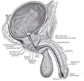 A prostatic stent is a stent used to keep open the male urethra and allow the passing of urine in cases of prostatic obstruction and lower urinary tract symptoms (LUTS). Prostatic obstruction[1] is a common condition with a variety of causes. Benign prostatic hyperplasia (BPH) is the most common cause,[2] but obstruction may also occur acutely after treatment for BPH such as transurethral needle ablation of the prostate (TUNA), transurethral resection of the prostate (TURP), transurethral microwave thermotherapy (TUMT), prostate cancer or after radiation therapy.
