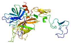 Protein C, also known as autoprothrombin IIA and blood coagulation factor XIV,[5]: 6822 [6] is a zymogen, that is, an inactive enzyme. The activated form plays an important role in regulating anticoagulation, inflammation, and cell death and maintaining the permeability of blood vessel walls in humans and other animals. Activated protein C (APC) performs these operations primarily by proteolytically inactivating proteins Factor Va and Factor VIIIa. APC is classified as a serine protease since it contains a residue of serine in its active site.[7]: 35 In humans, protein C is encoded by the PROC gene, which is found on chromosome 2.[8]
