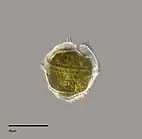 The phylum Haptista includes two distinct clades with mineralized scales: haptophytes and centrohelids.[10] The haptophytes (Haptophyta) are a group of over 500 living species[36] of flagellated or coccoid algae that have acquired chloroplasts from a secondary endosymbiosis. They are mostly marine, comprise an important portion of oceanic plankton, and include the coccolithophores, whose calcified scales ('coccoliths') contribute to the formation of sedimentary rocks and the biogeochemical cycles of carbon and calcium. Some species are capable of forming toxic blooms.[80] The centrohelids (Centroplasthelida) are a small (~95 species)[81] but widespread group of heterotrophic heliozoan-type amoebae, usually covered in scale-bearng mucous, that form an important component of benthic food webs of aquatic habitats, both marine and freshwater.[82]
