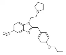 Protonitazepyne (N-pyrrolidino protonitazene) is a benzimidazole derivative with opioid effects, which has been sold as a designer drug over the internet, first being mentioned in mid 2022 and definitively identified in drug seizures in Canada in early 2023 and Ireland in late 2023.[1] It is an analogue of etonitazene where the ethoxy group has been extended to propoxy, and the N,N-diethyl substitution has been cyclised into a pyrrolidine ring. While formal studies into its pharmacology have yet to be carried out, it is believed to be slightly less potent than the ethoxy analogue etonitazepyne but still a potent opioid.[2][3]