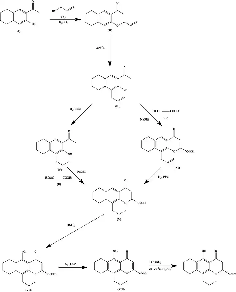The nitration of (V) with nitric acid in sulfuric acid gives ethyl 10-propyl-4-oxo-5-nitro-6,7,8,9-tetrahydro-4H-naphtho[2,3-b]pyran-2-carboxylate (VII), which is hydrogenated with H2 over Pd/C in ethanol-acetic acid to afford the corresponding amino derivative (VIII). At the end, this substance is diazotated with NaNO2 and H2SO4 and afterwards treated with 50% H2SO4 at 120 °C.[6]