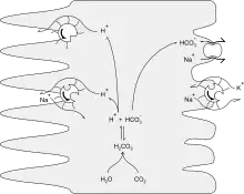 Proximal tubule cell showing pumps involved in acid base balance, left is the lumen of tubule