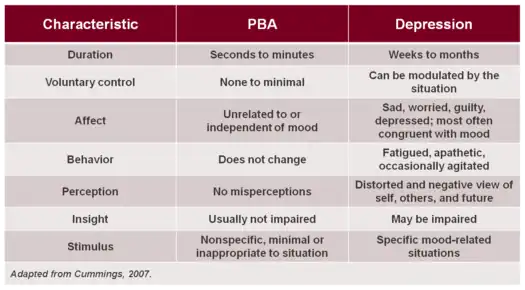 Several criteria exist to differentiate between PBA and depression.
