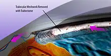 PEX can become problematic when the flakes become enmeshed in a "spongy area" known as the trabecular meshwork and block its normal functioning,[2] and may interact with degenerative changes in the Schlemm's canal and the juxtacanalicular area.[4] The blockage leads to greater-than-normal elevated intraocular pressure[2] which, in turn, can damage the optic nerve.[7] The eye produces a clear fluid called the aqueous humor which subsequently drains such that there is a constant level of safe pressure within the eye, but glaucoma can result if this normal outflow of fluid is blocked. Glaucoma is an umbrella term indicating ailments which damage the neural cable from the eye to the brain called the optic nerve, and which can lead to a loss of vision. In most cases of glaucoma, typically called primary open-angle glaucoma, the outflow does not happen normally but doctors can not see what is causing the blockage; with PEX, however, the flakes are believed to be a cause of the blockage.[7] PEX flakes by themselves do not directly cause glaucoma, but can cause glaucoma indirectly by blocking the outflow of aqueous humor, which leads to higher intraocular pressure, and this can cause glaucoma.[4] PEX has been known to cause a weakening of structures within the eye which help hold the eye's lens in place, called lens zonules.[2]