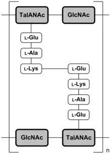 Pseudopeptidoglycan is composed of two sugars, N-acetylglucosamine and N-acetyltalosaminuronic acid. These sugars are made of different amino acids, and the peptide cross-links within pseudopeptidoglycan are formed with different amino acids. The peptide bond is formed between the lysine of a N-acetyltalosaminuronic acid and a glutamine of a parallel N-acetyltalosaminuronic acid.[6] Pseudopeptidoglycan, like peptidoglycan in bacteria, forms a mesh-like layer outside of the plasma membrane of the archaea.