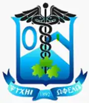 The badge of the Psi Omega Fraternity is an heraldic shield of gold with a slightly curved field of black enamel on which are displayed a caduceus, the letters ΨΩ, and three ivy-leaves. Colors are blue and white.[1]