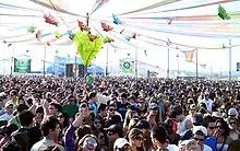 A psychedelic festival is a gathering that promotes psychedelic music and art in an effort to unite participants in a communal psychedelic experience.[45] Psychedelic festivals have been described as "temporary communities reproduced via personal and collective acts of transgression... through the routine expenditure of excess energy, and through self-sacrifice in acts of abandonment involving ecstatic dancing often fueled by chemical cocktails."[45] These festivals often emphasize the ideals of peace, love, unity, and respect.[45] Notable psychedelic festivals include the biennial Boom Festival in Portugal,[45] Ozora Festival in Hungary, Universo Paralello in Brazil as well as Nevada's Burning Man[46] and California's Symbiosis Gathering in the United States.[47]