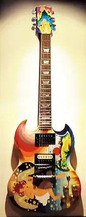 Blues rock singer Janis Joplin had a psychedelic car, a Porsche 356.[34] The trend also extended to motor vehicles. The earliest, and perhaps most famous of all psychedelic vehicles was the famous "Further" bus, driven by Ken Kesey and The Merry Pranksters, which was painted inside and out in 1964 with bold psychedelic designs (although these were executed in primary colours, since the DayGlo colours that soon became de rigueur were then not widely available).[35] Another very famous example is John Lennon's psychedelic Rolls-Royce – originally black, he had it repainted in 1967 in a vivid psychedelic gypsy caravan style, prompting bandmate George Harrison to have his Mini Cooper similarly repainted with logos and devices that reflected his burgeoning interest in Indian spirituality.[36]