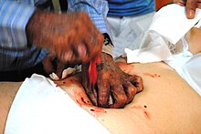 Although psychic surgery varies by region and practitioner, it usually follows some common lines. Without the use of a surgical instrument, a practitioner will press the tips of their fingers against the patient's skin in the area to be treated. The practitioner's hands appear to penetrate into the patient's body painlessly and blood seems to flow. The practitioner will then show organic matter or foreign objects apparently removed from the patient's body, clean the area, and then end the procedure with the patient's skin showing no wounds or scars.[8]