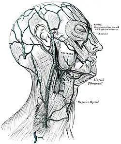This plexus communicates freely with the anterior facial vein; it also communicates with the cavernous sinus, by branches through the foramen Vesalii, foramen ovale, and foramen lacerum. Due to its communication with the cavernous sinus, infection of the superficial face may spread to the cavernous sinus, causing cavernous sinus thrombosis. Complications may include edema of the eyelids, conjunctivae of the eyes, and subsequent paralysis of cranial nerves which course through the cavernous sinus.