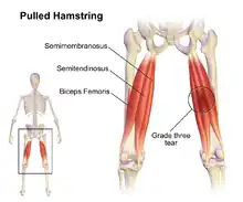Straining of the hamstring, also known as a pulled hamstring, is defined as an excessive stretch or tear of muscle fibers and related tissues. Hamstring injuries are common in athletes participating in many sports. Track and field athletes are particularly at risk, as hamstring injuries have been estimated to make up 29% of all injuries in sprinters.[1] Hamstring injuries can also come with a hip injury from sprinting. Symptoms for a hip injury are pain, aching and discomfort while running or any physical exercise.