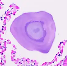 - ↑ Barnard, NJ; Crocker, PR; Blainey, AD; Davies, RJ; Ell, SR; Levison, DA (1987). "Pulmonary alveolar microlithiasis. A new analytical approach". Histopathology. 11 (6): 639–645. doi:10.1111/j.1365-2559.1987.tb02674.x. PMID 3623431. S2CID 9063464.